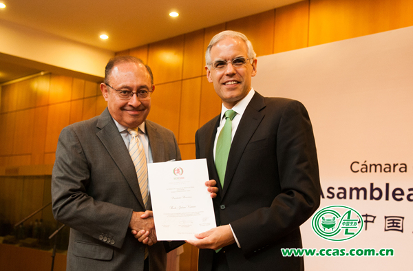 中国墨西哥商会主席艾夫仁·卡尔沃向中国经济联络中心副主任吴保才颁发名誉顾问证书