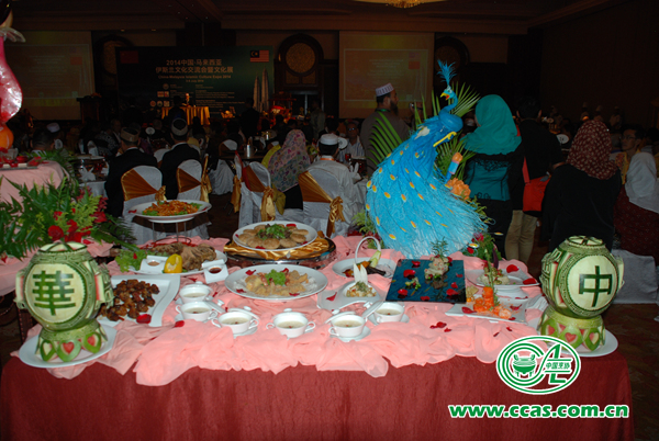 宴会的菜单设计颇具穆斯林特色。凉菜包括“香草桃仁”、“泰州酱萝卜”、“ 香烤籽鱼”、“飘香牛肉粒”、“椒麻鸡”。小吃包括“艾窝窝”、“豌豆黄”、“阿静糖包”、“手把馓子”、“拇指酥馍”。热菜包括“养生松茸汤”、“手抓羊肉”、“香辣鸡丁”、“交思汤配烧饼夹肉”、“金丝凤尾虾”、“如意吉祥”、“炸酱面”,共17道特色美食。宴会厅门口陈列着由18种中国小吃组成的“中华美食”瓜钟和“孔雀开屏”展台,于细微处尽显中国清真美食文化的丰富内涵。与会嘉宾对中国厨师的精湛技艺和舌尖上的中国美味赞不绝口。大家在愉悦的气氛中品中国美食、论中国文化、赞中马友谊,美食外交展示出蓬勃的生命力。