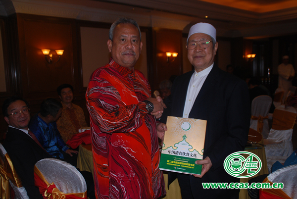 中国烹饪协会名誉会长陈广元将中国烹饪协会编写的《中国清真饮食文化》赠送马方政要
