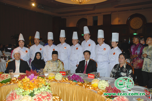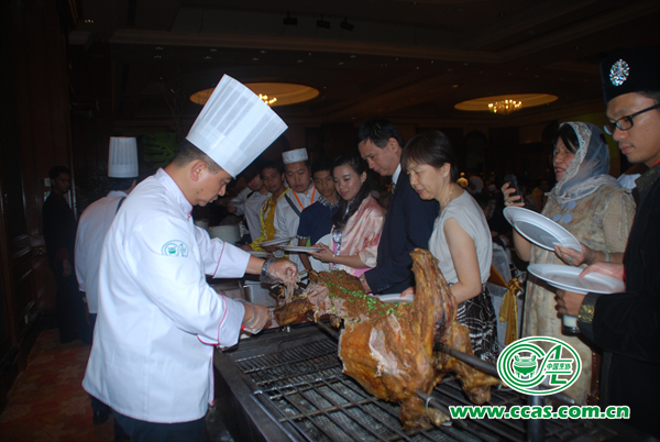 当晚,恰逢穆斯林斋月期间,由中国烹饪协会主办的“中国清真美食走进马来西亚开斋晚宴”精彩亮相,成为“2014中国·马来西亚伊斯兰文化交流会暨中国伊斯兰文化展活动”的夺目亮点,使中马伊斯兰文化交流活动达到高潮。来自中国的八位技艺精湛厨师,为此场活动设计了数十道中国清真美食菜肴,包括18凉菜、18道热菜和22道特色小吃等色香味俱全,集中体现了中餐烹饪的高超技艺,令贵宾们钦佩不已。嘉宾们对香气四溢的烤全羊赞不绝口,连连称道为最美味的羊肉菜肴之一。场内象征中马友好邦交40周年的精美展台,让大家欣赏不已,排队品尝美食,还纷纷举起相机拍照留影。 马来西亚前首相马哈蒂尔在宴会上发表了热情洋溢的致辞,他表示,中国清真美食文化历史悠久,丰富多彩,异彩纷呈,对进一步增进马中两国人民之间的友谊,加深两国文化的交流发挥着重要作用。