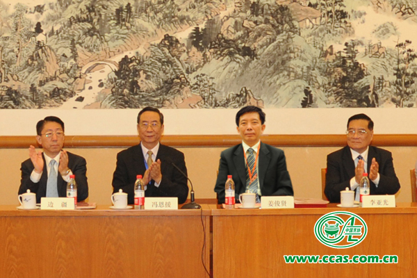 中国烹饪协会会长姜俊贤(右二)和专职副会长冯恩援(左二)、李亚光(右一)、边疆(左一)