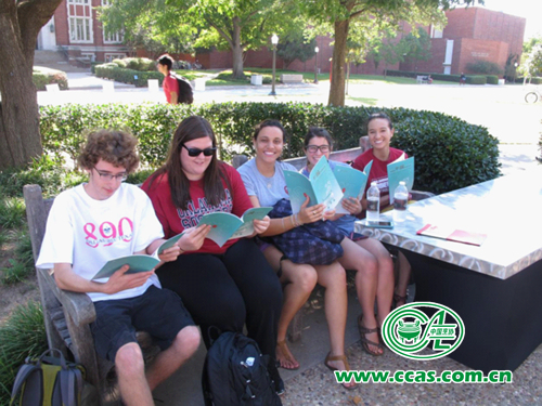 俄大学生在校园开心地阅读《璀璨的中国饮食文化》一书