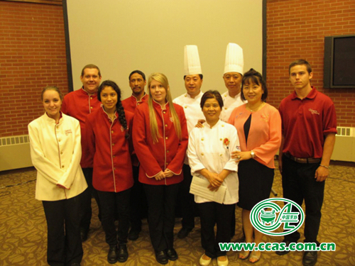 俄大孔子学院院长苟学红(右二)与中国厨师和参与“美食精品宴”的美方服务人员合影留念
