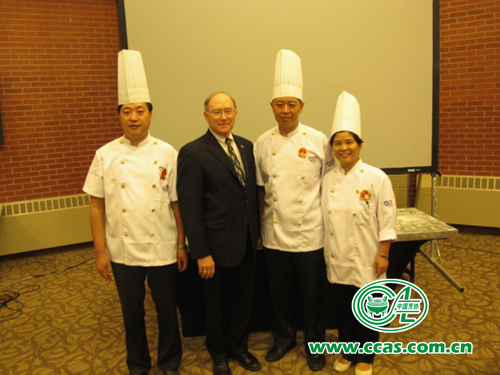 俄大终身名誉文理学院院长、孔子学院理事会主席博文理(Paul B. Bell)与三位中国厨师胡宗强(左一)、宋京吉(左三)、杨春雨(左四)合影留念