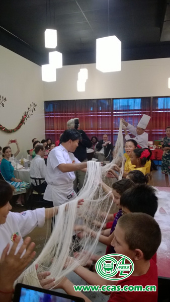 宴会现场,宋京吉表演了独具特色的花式拉面技艺,使现场嘉宾欣赏表演的过程中一片欢腾,尤其是跟随父母前来参加宴会的小朋友们,纷纷踊跃上前参与拉面表演,用双手感受了中国美食文化。