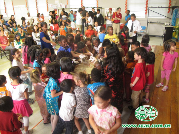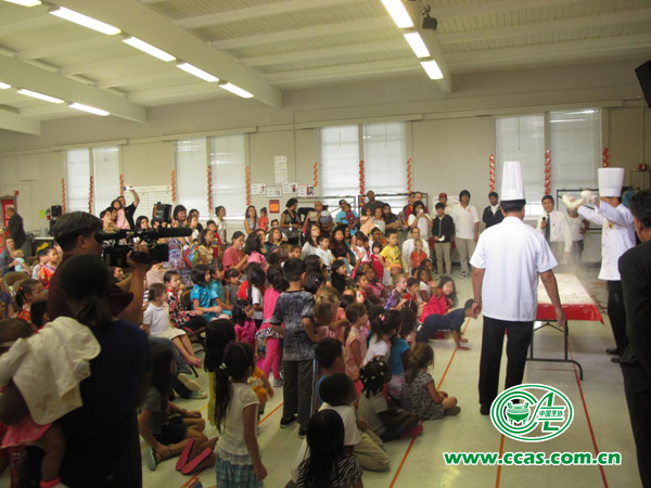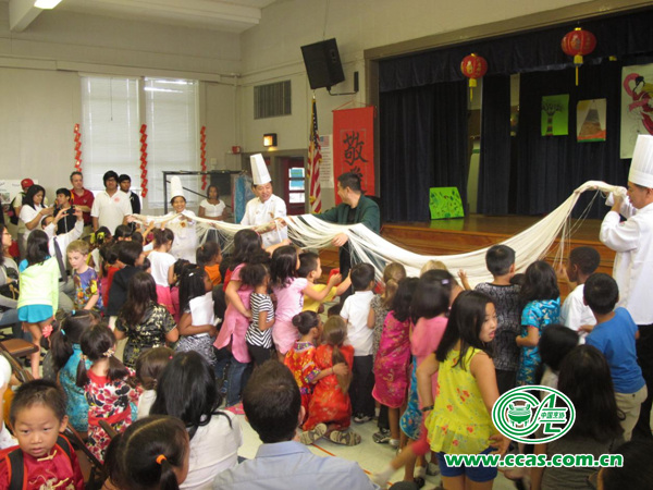 表演现场气氛非常热烈,由中国厨师杨春丽主持制作的四道面点小吃受到来宾的热烈欢迎,宋京吉师傅现场表演的花式拉面绝活受到来宾热烈的掌声,当地美国小朋友们说,自己还从未见过如此活泼有趣的美食表演。拉面表演结束后,小朋友们蜂拥上前,都要亲手摸摸那精细的面条。中国美食文化在美国小朋友的童心中留下了美好的印象。