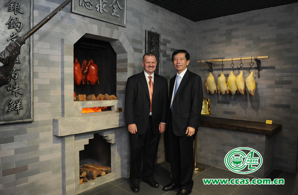会见结束时,姜俊贤会长向里克主席赠送了协会会旗及具有中国传统文化的纪念品。随后,里克主席在姜俊贤会长的陪同下,参观了全聚德烤鸭博物馆。姜会长作为曾经亲自操盘、带领“中国餐饮第一股”全聚德成功上市的全聚德集团董事长,为里克主席全面介绍了体现中国餐饮成长历程的全聚德150年发展史。