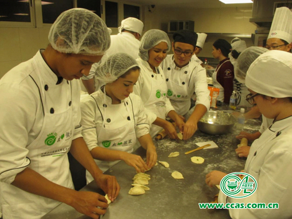 帕博洛·利瓦斯工业与技术专科学院的学生认真练习包饺子