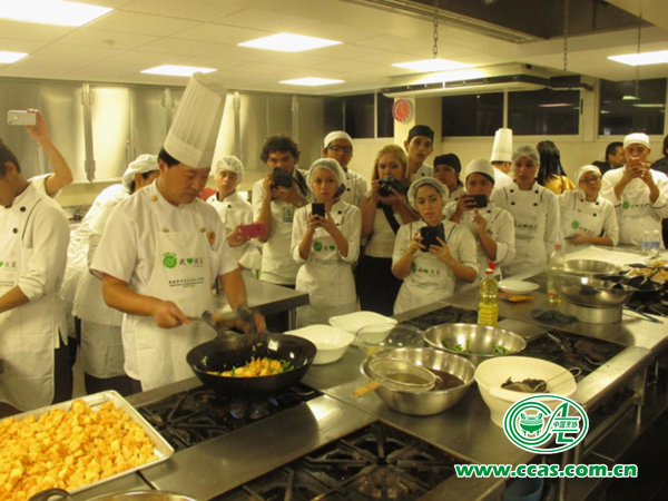 胡宗强师傅在帕博洛·利瓦斯工业与技术专科学院演示中国炒菜秘诀,学生们纷纷拍照