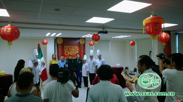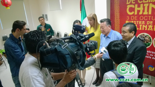 中国美食代表团在墨西哥的活动被帕博洛·利瓦斯工业与技术专科学院精心组织的中国美食节推上了辉煌的峰巅,这是代表团始料未及的。10月2日,中国美食节隆重的开幕仪式在帕博洛·利瓦斯工业与技术专科学院举行,当地数家媒体蜂拥而至,在闪光灯和摄像机簇拥下,帕博洛·利瓦斯工业与技术专科学院莫宜斯·莫利那·雷蒙斯、新莱昂自治大学孔子学院院长萨拉·艾丽西亚·安西拉·阿莱琪格女士和中国美食代表团李光璧团长接受采访,中国美食代表团在媒体前集体亮相,尽显风采。