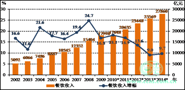 图1. 全国餐饮收入及同比增幅状况(2002~2014年)