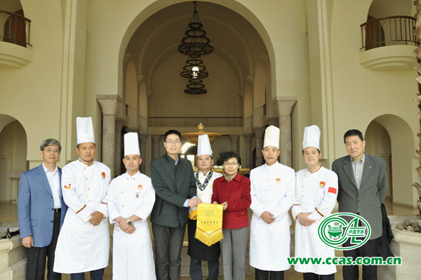 中国美食文化代表团向边燕花大使赠送中国烹饪协会会旗