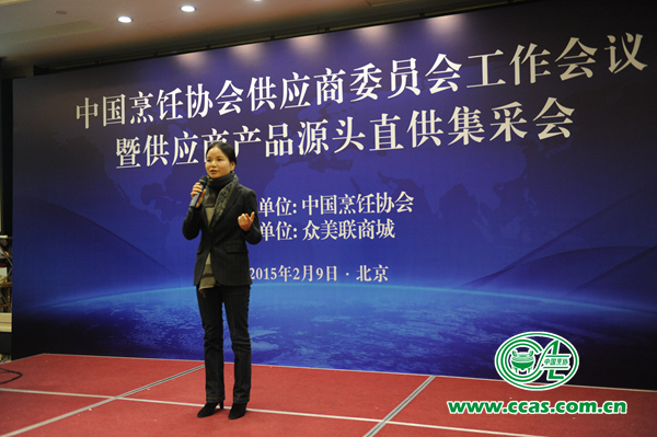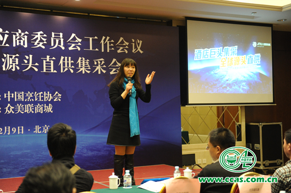 供应商委员会新当选的副主席,众美联创始人、董事长朱小霞,站在供应商和餐饮企业的双重角度,介绍了众美联B2B平台运用模式对餐饮业成本控制、采购便捷、食品安全的重要性。