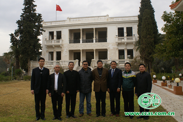 沈中文参赞与(左五)与使馆武官(左四)在馆内与中国美食文化代表团合影留念,身后是使馆老办公大楼,现已经成为见证使馆光荣历史的标志
