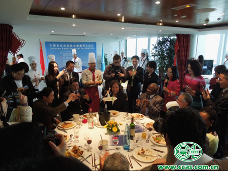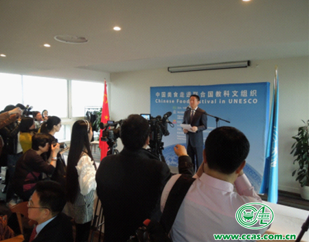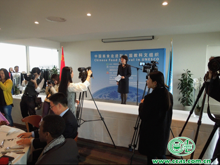 当地时间3月24日,“2015中国非遗美食走进联合国教科文组织”活动开幕式暨中国非遗美食品鉴在巴黎联合国教科文组织总部餐厅隆重举行。中国常驻联合国教科文组织代表团大使张秀琴,联合国教科文组织副总干事格塔卓.恩吉达、助理教育总干事唐虔等140多位来自世界各国常驻联合国教科文组织的大使、高级外交官参加了活动。20余位中国驻法及当地主流媒体现场采访了此次活动。中国烹饪协会副会长边疆、特邀副会长名厨委员会主席高炳义率领由20位中国名厨组成的中国代表团出席了开幕式并为各国贵宾奉献了丰富多彩的中国非遗美食。