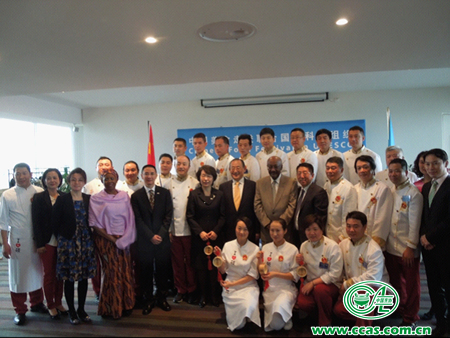 中国代表团厨师整装登台与张秀琴大使、格塔卓恩吉达副总干事长、唐虔助理教育总干事、边疆、高炳义副会长等合影留念