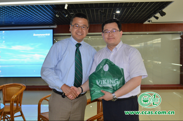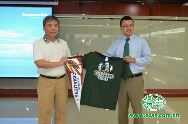 中国烹饪协会副秘书长张大海(右)与克利夫兰州立大学孔子学院院长周海刚(左)互赠礼物