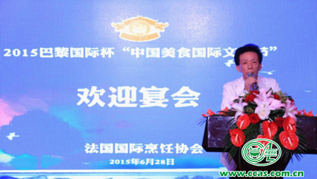 王加清主席在欢迎词中说,本届巴黎国际杯“中国美食国际文化节”的活动项目和参加人数均超过以往任何一次中国美食的国际交流活动,还有中国、法国、德国、奥地利、比利时、加拿大、韩国、丹麦、西班牙、意大利、日本、美国、卢森堡、马来西亚、荷兰、俄罗斯、新加坡、瑞典、瑞士、捷克、土耳其、香港、台湾等23个国家和地区的大师、名厨陆续到达巴黎。中国饮食文化源远流长,此次重要的国际活动,为各国中餐业创造了一个新的交流平台,使大家得以互相学习交流,共同发展提高。现在中国的国际地位大大提升了,我们也要在全世界范围内传播中国饮食文化,进一步扩大其国际影响力。我代表法国华人华侨热烈欢迎庞大的中国代表团的到来。祝愿巴黎国际杯“中国美食国际文化节”暨2015巴黎“国际烹饪中餐大赛”取得圆满成功!