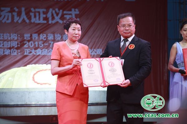 7月24日,中国烹饪协会,秦皇岛市人民政府主办,正大集团支持的秦皇岛国际沙滩美食文化节现场,世界纪录协会的高级认证官全程见证了大包子的制作过程,宣布由正大食品企业(秦皇岛)有限公司研发的直径为2.57米、重量为1367千克的“巨型包子”挑战世界纪录成功,向正大食品集团颁发了世界纪录认证证书。同时,秦皇岛市质量技术监督局向正大食品(秦皇岛)有限公司总裁周丽华颁发了质量合格报告。