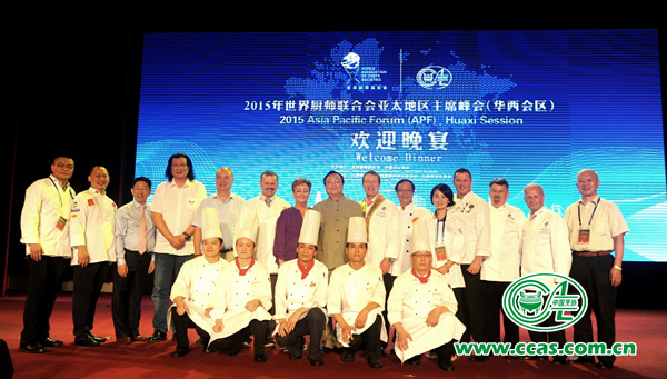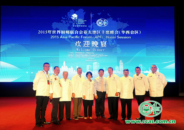9月6日晚,中国社会主义新农村----华西村龙希国际大酒店大庆厅张灯结彩,2015世界厨师联合会亚太主席 峰会首站活动在这里拉开帷幕。世界厨师联合会主席、各委员会主席以及来自亚洲、太平洋洲、非洲等27个国家和地区的世厨联会员国厨师组织60余位主席、副主席和20余位青年厨师代表从亚太各地汇聚中国华西。