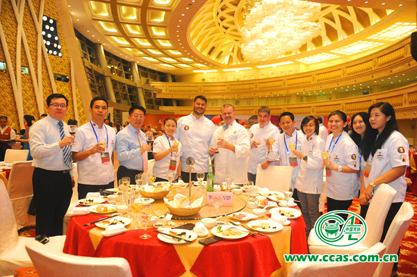 夜幕降临,在鸡尾酒会的亲切交谈后,各国参会代表步入大庆厅就座,参加由江阴市政府、华西村组织的大型欢迎晚宴。世界厨师联合会主席查尔斯·卡罗尔、亚洲区主席里克·史蒂芬、世厨联教育委员会主席约翰·克兰西、比赛委员会主席奥托·韦贝尔、无国界委员会主席梁世安、青年委员会副主席艾伦·奥瑞尔、中国烹饪协副会长会边疆、副会长、副秘书长张大海、前江苏省政协副主席陆军、江苏省烹饪协会副会长吴协平等国内外贵宾出席了欢迎晚宴。