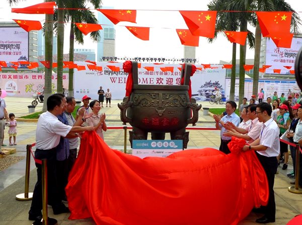 中华食鼎寓意去年12月顺德被联合国教科文组织授予“世界美食之都”称号,是粤菜获得世界认可的重要象征,预示着顺德美食已达到世界“顶级”,也是顺德人民建设“世界美食之都”努力的历史见证。