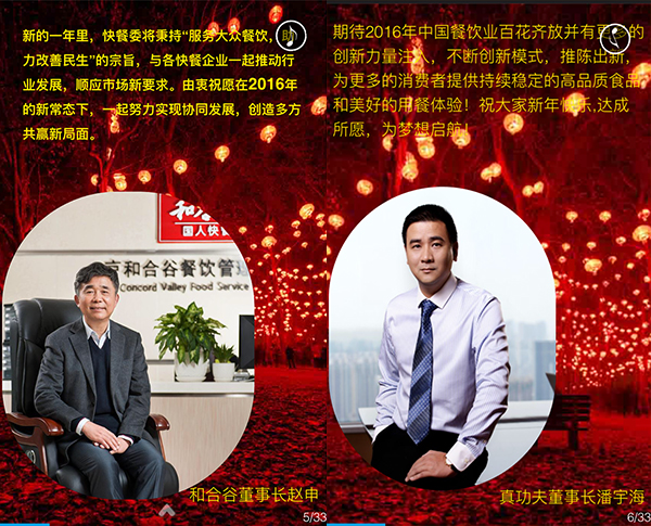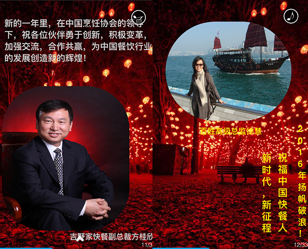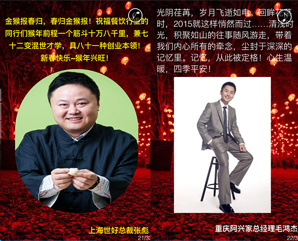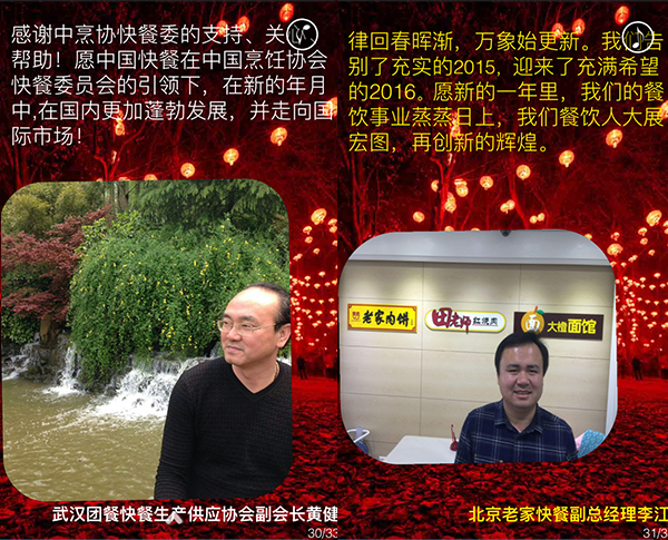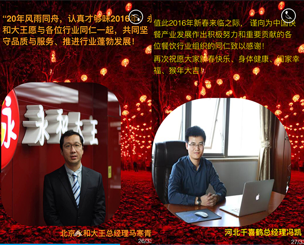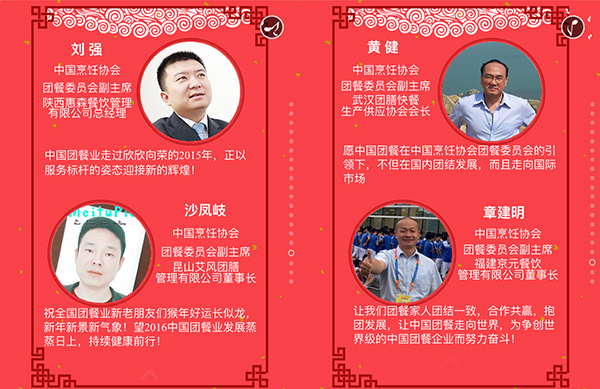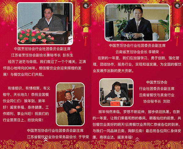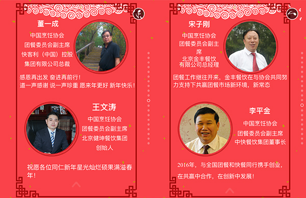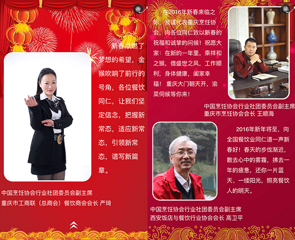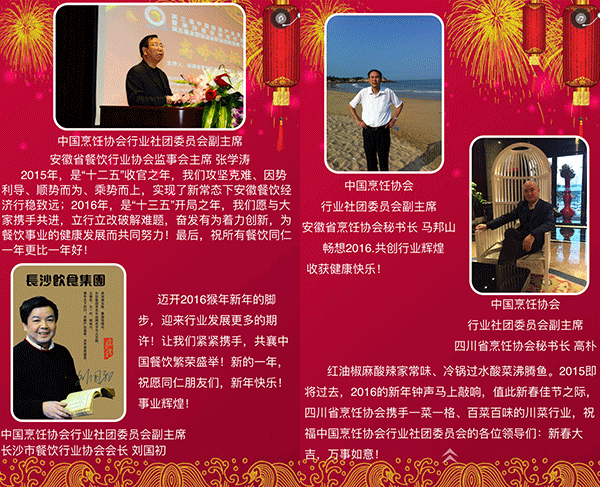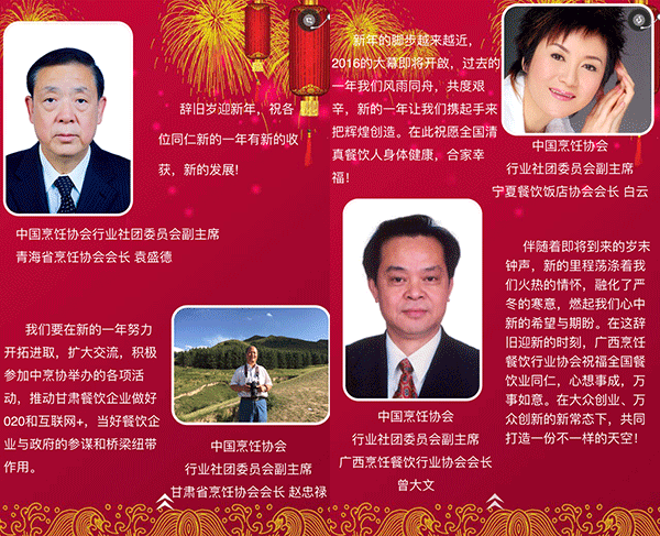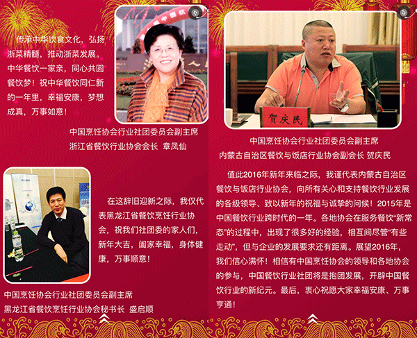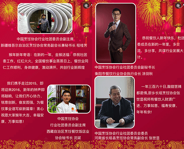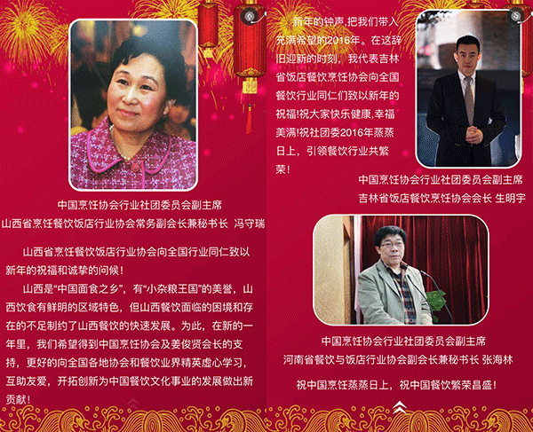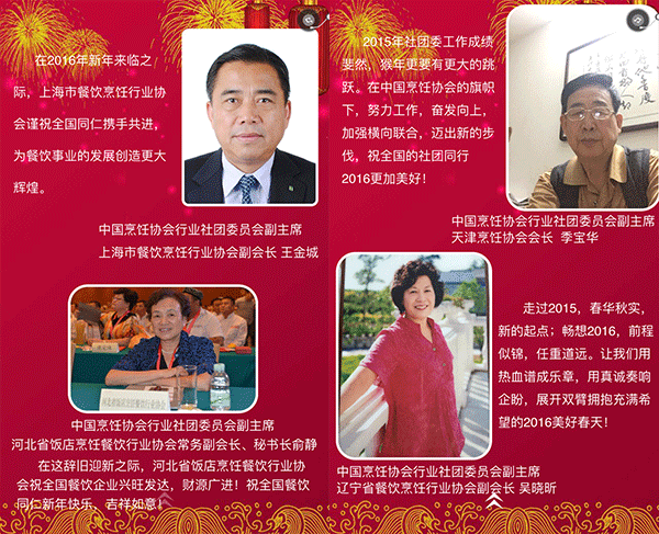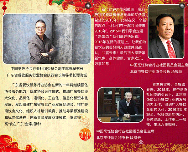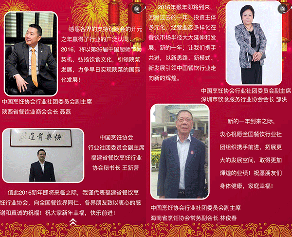 2015年,我国餐饮行业以3万亿的成绩实现了“十二五”的完美收官,在这辞旧迎新之际,我谨代表中国烹饪协会,向全国各地及海外的餐饮工作者致以新年的问候,向关心、支持餐饮业发展的各级领导和社会各界朋友们表示由衷的感谢,向节日期间奋斗在餐饮服务一线的同志们表示亲切的慰问,祝大家在新的一年里,事业兴旺、身体健康、阖家幸福!