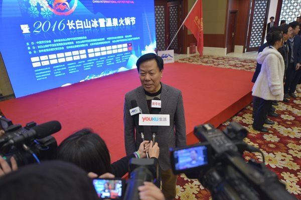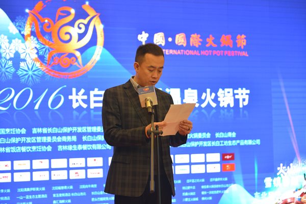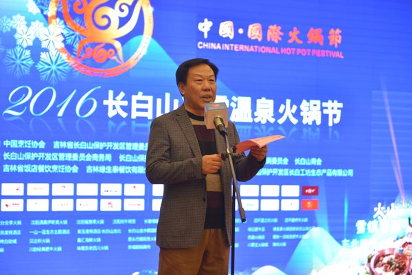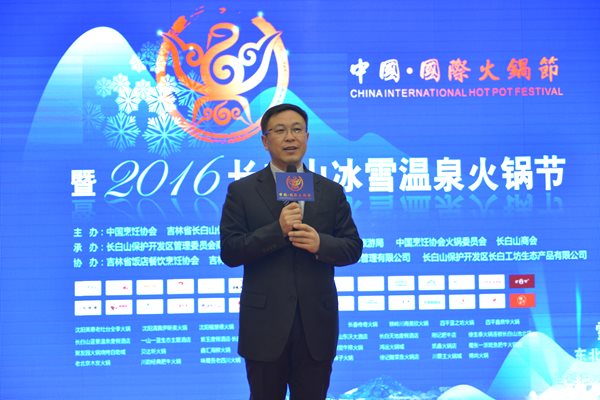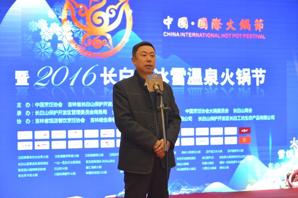12月26日上午,在长白山举行了中国国际火锅节首发站暨2016长白山冰雪温泉火锅节启动仪式,中国烹饪协会副会长、中国烹饪协会火锅委员会主席汤庆顺,吉林省商贸服务业发展办公室主任贾东平,中国烹饪协会特邀副会长、吉林省饭店餐饮烹饪协会会长生明宇,长白山保护开发区管理委员会商务局局长赵兴利、旅游局副局长杨荣臻、中国烹饪协会火锅委员会秘书长康斓,吉林省饭店餐饮烹饪协会火锅烧烤委员会主席胡亚全,长白山商会会长马洪君一起启动了开幕式, 来自全国各地的知名火锅企业掌门人、各地家庭消费者代表们共同参与,共同见证了中国国际火锅节首发站——走进长白山活动开幕式的火热盛况。