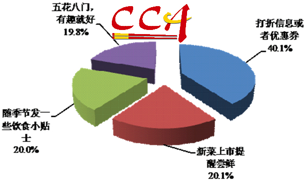 受访者最关注的微信推送信息依次是,“打折或优惠信息”“新产品上市尝鲜提醒”“饮食小贴士”和“其他有趣信息”(图9)。有20%左右的人经常因看到微信公众账号的推送内容而决定前往就餐,只有9.9%的人对这些信息“无动于衷”。
