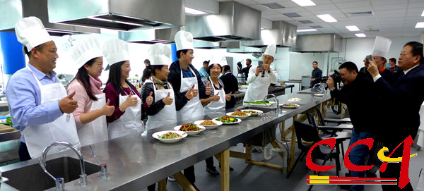 在制作菜品中团员们与教师交流,进一步了解了学校的体制、教学和技术人才培训渠道,考察团员们正宗的中式烹饪方式引起了在校学生们的极大兴趣,纷纷围绕观看、争先品尝,现场气氛热烈。此刻没有国籍的限制、没有年龄的差异、更没有专业的约束,美食和创新让考察团每位成员与师生们瞬间成为亲密的朋友。边疆团长和几家大型餐饮企业老总就建立合作机制,促进两国烹饪技术教育培训师资、学生交流交换了意见,达成了共识。临别前,边疆团长向院长赠送了中国烹协会旗,并送上北京花家怡园的京味传统特色小吃八大件。