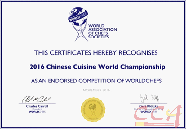 2016年3月31日,由中国烹饪协会主办的“2016中餐烹饪世界锦标赛”成功获得世界厨师联合会官方认证,成为本年度首个获得国际组织认证的中餐技术大赛,也是全球唯一专业国际中餐赛事。