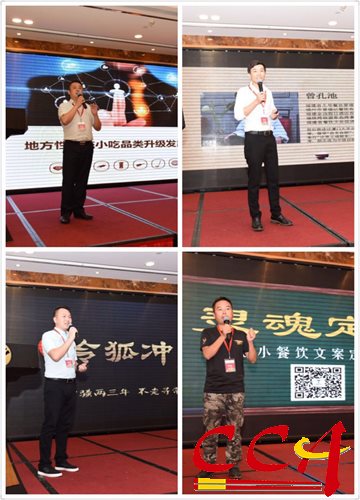 淳百味餐饮董事长张万和、久号餐饮创始人曾孔池、令狐冲董事长郑锦清及深土小餐饮定位公司创始人陈莫演讲