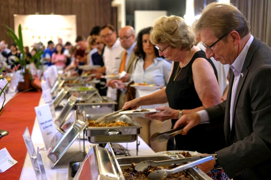 晚宴的高潮是美食品尝。当主持人宣布晚宴开始,200多位来宾立即排成一条长龙,尽管他们都以迫不及待。中国烹饪大师设计制作的22道精美的菜点在古堡水晶灯的照耀下散发出诱人的色彩,阵阵香气更让人垂涎欲滴。长桌前来宾们井然有序、轻声细语,但从他们投入的关注和品尝的满足表情可以看出,中国非遗美食已经令他们完全折服。