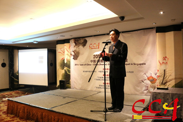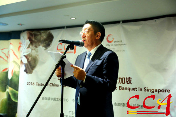 中国美食代表团副团长、顺德区旅游局副局长欧伟中先生在宴会上发表了致辞。他说,2014年,顺德被联合国教科文组织授予“世界美食之都”称号,这一殊荣的获得,让顺德美食、文化、城市发展都站上了一个全新的高度,也使顺德美食发展站上了一个全新的起点。今年顺德区旅游局和中国烹饪协会再度携手,策划了本次“2016源味中国——中国(顺德)美食走进新加坡”活动,继续深化顺德世界美食之都建设,推进顺德美食走上了国际文化的高端舞台。
