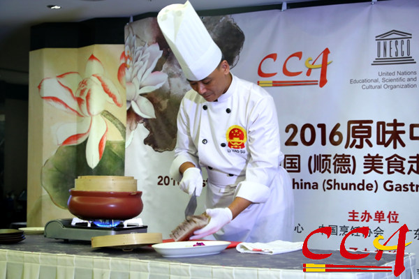 晚宴开始,中国美食代表团的厨师长李耀苏师傅身着绣着国徽的厨装闪亮登场,为现场的嘉宾表演顺德特色美食“均安蒸猪”。精致的蒸笼里冒着热腾腾的水汽,李师傅熟练地操刀表演,刚蒸出来的猪肉晶莹剔透,既富有弹性又软嫩多汁,切好装盘在上面撒上一把芝麻,其色其香甚是诱人。李师傅把蒸猪端到贵宾席前,请陈振泉部长、陈晓东等贵宾品尝,尝到蒸猪的贵宾们被顺德美食的鲜香征服,不住点头称赞。随后,热气腾腾的蒸猪作为第一道主菜被端上来宾餐桌,而来宾们都放下斯文,用手机和相机记录下了顺德美食给予他们的惊艳印象。