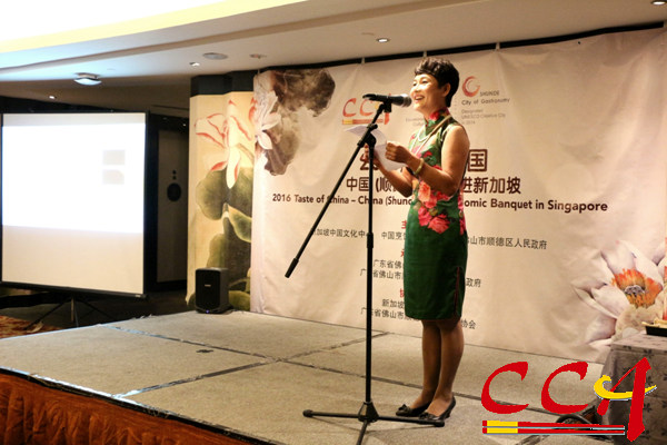 晚宴由新加坡中国文化中心主任马红英主持。身着现代款旗袍的马主任首先代表中国文化中心对各位光临晚宴的嘉宾表示热烈欢迎,并对精心筹备晚宴的中国美食代表团和同乐集团表示感谢。她说,中国美食文化是中国文化的重要组成部分,来自联合国教科文组织“世界美食之都”的广东顺德名厨将为大家奉献具有浓郁历史文化特色的经典美食,让各位尽享中国美食文化盛宴。