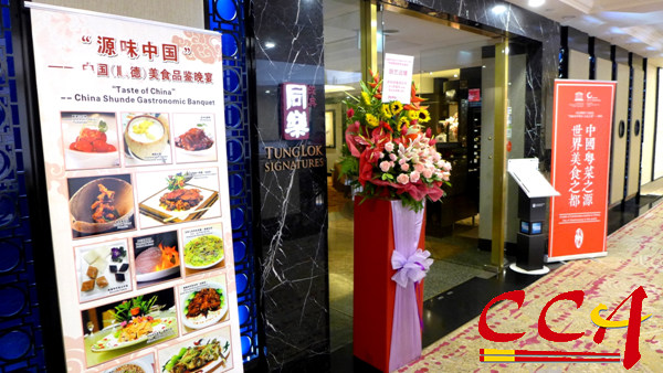同乐经典是新加坡餐饮巨贾同乐集团旗下中餐名店,中国美食品鉴晚宴筹备使这里洋溢着欢乐的气氛,门前早早就摆放了花篮和中国美食文化、顺德名厨介绍的易拉宝,门前的大厅也摆放了迎宾的鸡仔饼、蹦沙、南乳花生等顺德名吃和香槟,让祖籍广东福建的新加坡来宾倍感亲切。