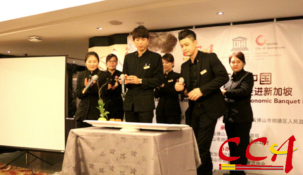 为使晚宴立体展现中国文化特色,中国驻新加坡大使馆文化参赞肖江华提议用中国七种名花命名了晚宴席位,牡丹、茉莉、芙蓉、杜鹃、兰花、桂花、荷花即让号称“花园中的国家”新加坡的来宾们倍感舒适亲切,也表现出文化外交家的创意与智慧。而每款菜点端上台时,佛山市顺德区均安镇副镇长李松简短而明了的介绍,更是成为来宾品鉴中国美食文化的最好“画外音”。