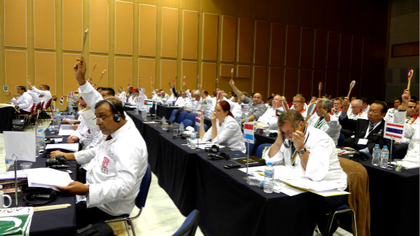 在今天的大会上,各国代表听取了世厨联主席查尔斯做的工作汇报;讨论通过了世厨联章程的修改意见;听取了三位董事会资深元老回顾世厨联88年的发展历程,大会特别邀请世界厨联的创始人----法国著名厨师埃科菲先生的孙子,在会上介绍了埃斯科菲先生一生帮助和培养青年厨师的光辉业绩;邀请南非厨师协会主席介绍了世厨联终身荣誉委员、南非名厨比尔·格拉戈先生为世界厨师事业发展进步积极奉献一生的感人事迹。除此之外,世厨联董事会成员以及各洲际主席听取了参会代表对世厨联经济收支、组织运行、媒体推广、章程遵守等方面的建议,并回答了代表们的疑问。大会开始前,主办单位发给每位代表团负责人每人一只木勺,上面贴有各国国旗,在大家行使投票权利时,每人就用举起或落下木勺表示字迹的态度。主办单位的别出新裁化解了针锋相对的矛盾。