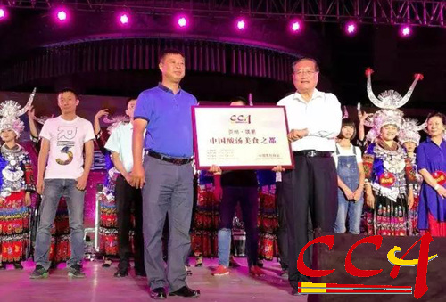 10月3日晚上,在凯里苗侗风情园广场举办的“中国酸汤美食之都”颁奖晚会上,中国烹饪协会副会长李亚光向凯里市委副书记、市长罗杰颁发了“中国酸汤美食之都”牌匾。同时公布了经过行业专家组评选产生出凯里市首批中国美食品牌企业及特色菜品,其中贵州金凯美悦酒店管理有限公司、贵州亮欢寨餐饮娱乐管理有限公司、凯里市苗侗土菜馆、贵州苗岭高山酒店管理有限公司、凯里云谷田园生态景观餐饮管理有限公司五家餐饮企业获“中华餐饮名店”荣誉称号;贵州亮欢寨餐饮娱乐管理有限公司、凯里市苗侗土菜馆、凯里市李茂端野竹笋腊猪脚火锅店等四款火锅荣获“中华名火锅”; 侗家开心腌肉、土司腌菜肉、冰杨梅、侗乡老卤麻鸭、桃妹蓝莓冰粉、猪脑壳凉面等六款产品荣获“中国名菜” 、“中华名小吃”荣誉称号,以及贵州美食名系列品牌企业及特色菜品。