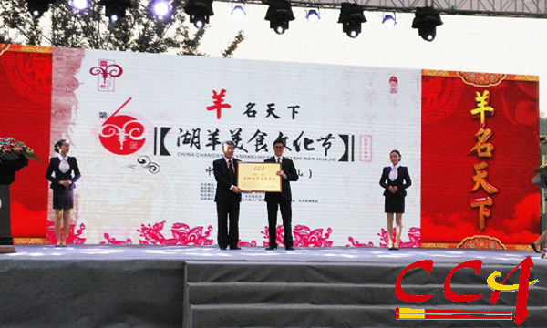 中国烹饪协会乔杰秘书长向吕山乡党委书记沈自强授予“中国湖羊美食名乡”荣誉称号