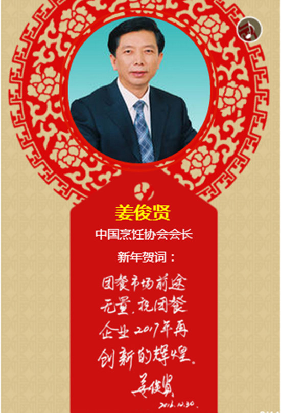 2017年新年之际,中国烹饪协会会长姜俊贤向全国团餐业发表新年贺词:团餐市场前途无量,祝团餐企业2017年再创新的辉煌!