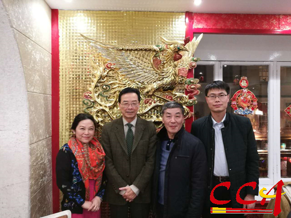 乔杰秘书长专程拜访英国华人餐饮协会会长陈德樑先生(左二)、副会长花炜女士(左一)