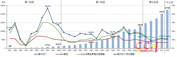 “促转型、调结构”成为此阶段的关键词,针对市场的新变化,全行业及时调整结构,重新回归大众,及时转型,逐渐步入理性发展的轨道。2014年开始摆脱低谷、稳定回暖;2015年趋于稳定,同比增速为10.8%。餐饮收入最终以32310亿元、同比增长11.7%的成绩为“十二五”完美收官。