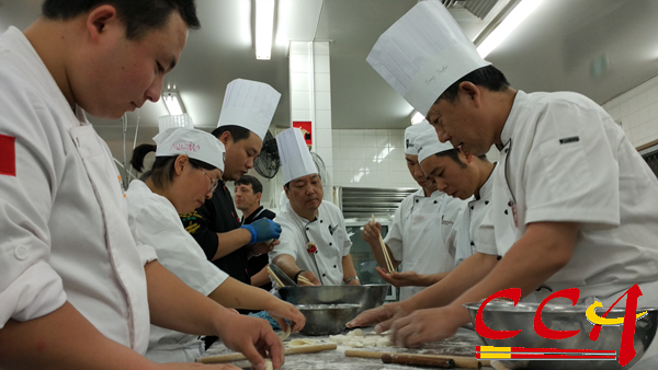 午宴菜谱由进修团团员共同讨论设计,精选了十几道体现中国各地特色的精品美食。菜品包括:本帮熏鱼、上海葱油鸡、中式蓑衣黄瓜、山东宫保虾球、福建王子大公鲟、兰州大漠烤羊腿、台湾三杯尤魚、广西啤酒鸭、江苏狮子头、安徽功夫鱼、香港上汤焗龙虾、中式西芹坚果、山东蒜香蒸粉丝白菜、国宴鸡豆花、老北京炸酱面、中式八宝饭、中式家常饺子。来自辽宁丹东的苗大师,根据现有食材即兴完成的一套中式主题果蔬雕成为午宴的一大亮点。在午宴进行中,穿插了每位主厨对各道菜点的介绍,以及菜点的来历、文化内涵、营养特点等,所有嘉宾都赞不绝口,现场掌声此起彼伏。