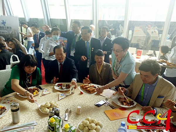 中国饮食文化源远流长,京菜起源于辽金,具有深厚的饮食文化内涵。中外嘉宾在招待会上“观京景,尝京菜,听京韵”中感受淳厚的北京风情和饮食文化。大家登上二楼中国美食文化厅,伴随着琵琶、手鼓弹奏的“送我一支玫瑰花”悠扬乐曲,品尝着北京健坤餐饮集团精心制作的一道道地道京菜,京酱肉丝、小碗牛肉、葱爆羊肉、肉末烧饼等各式精致的北京特色菜肴,尽展京菜魅力。北京庆丰包子铺总经理高文慧带来中华小吃文化厅京味儿小吃牛肉大葱包和春卷,供各国嘉宾品尝,更增添了京菜文化风情。
