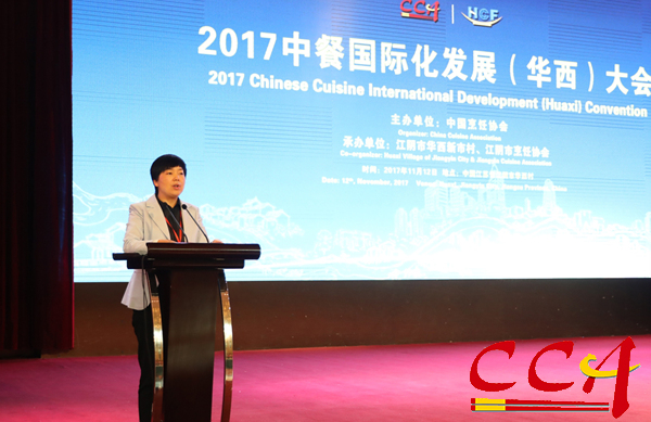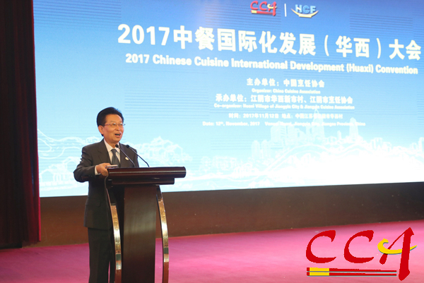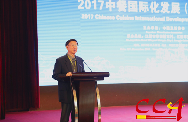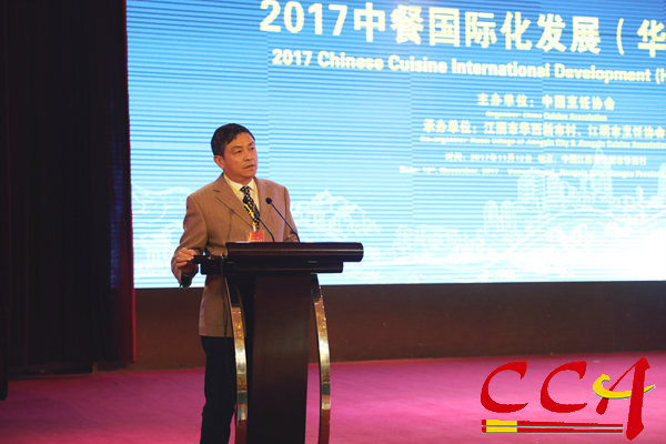 中国烹饪协会会长姜俊贤在大会上发表了《坚定民族自信,促进中餐国际化发展》主题报告。他说:“随着中国经济实力的不断增强以及国际影响力的不断扩大,中国正在走进国际舞台的中心,中国餐饮文化的国际影响逐渐增强,中餐国际化已成为大势所趋。特别是中国共产党第十九次代表大会的隆重召开,为中国实现社会主义强国奠定了坚实的基础,中国在国际上的地位将进一步提升。在这一背景下,我们隆重举办‘2017中餐国际化发展(华西)大会’,以搭建国际中餐务实交流平台,弘扬中国饮食文化,促进海内外中餐业联动发展。”本次国际性交流大会是中国烹饪协会践行“一带一路”发展战略,贯彻党的十九大关于“加快培育国际经济合作”的战略方针,落实商务部中餐“走出去”规划的最新举措。