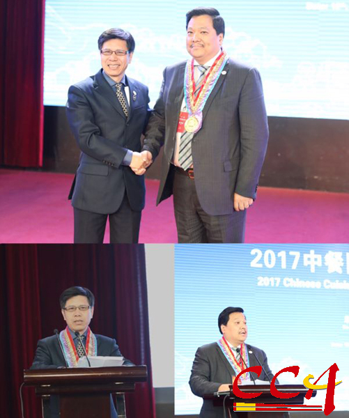 中国烹饪协会会长姜俊贤和美国中餐联盟主席朱天活向顾浩和陆军授予大会终身荣誉牌