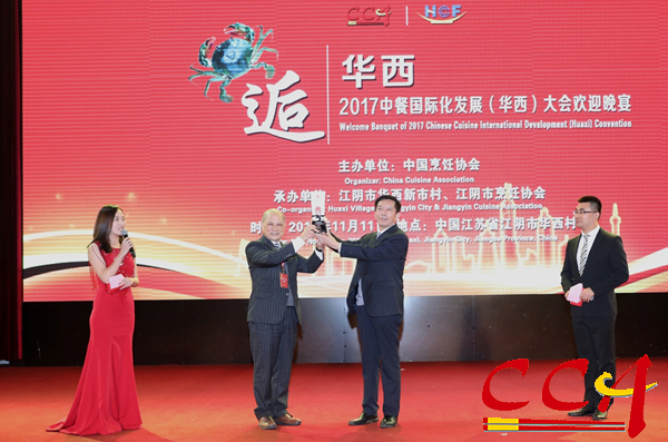 为表彰为中餐国际化发展做出了突出贡献的相关领导与行业人士,中国烹饪协会会长姜俊贤为江苏省委原副书记、江苏省烹饪协会名誉会长顾浩,江苏省政协原副主席、江苏省烹饪协会名誉会长陆军颁发了“中餐国际化发展(华西)大会终身荣誉主席”奖牌。