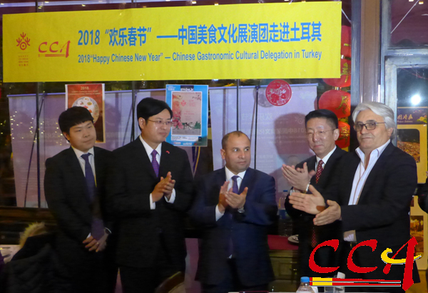 在开幕式上,Gultekin Karatas副区长首先对中国文化部“欢乐春节”美食展演团表示热烈欢迎,他高度评价了中国“一带一路”倡议给中土关系带来的新的发展,表示土耳其政府非常支持中土两国经济、文化的往来,也期待着美食文化的交流给两国人民带来亲情和口福。钟洪糯副总领事表示,“欢乐春节”活动就是要建立一个平台,使我们与本地人民一起共度中国春节、共享中国文化、共建和谐世界,中国和土耳其都具有悠久灿烂的历史文化,中国在丝绸之路的最东端,土耳其在最西端,今晚的活动就是用美食来拉近两国人民之间的距离。边疆副会长在讲话中对中国驻伊斯坦布尔总领事馆和伊斯坦布尔玛尔特帕区政府对此次“欢乐春节”中国美食走进土耳其活动的大力支持表示感谢,希望能够用中国名厨的精湛技艺为“一带一路”的建设发展和中土两国人民友谊做出贡献。